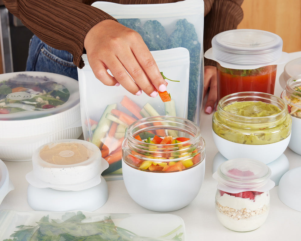 A perfectly plastic-free storage bag crafted from 100% food-grade silicone with no chemicals, glues, or adhesives. This 50 oz bag is perfect for sous-viding or for storing lengthier produce items like stalks of celery, herbs, or carrots. All of our bags are made from a single piece of silicone with curved edges so you don’t get any moldy buildup.