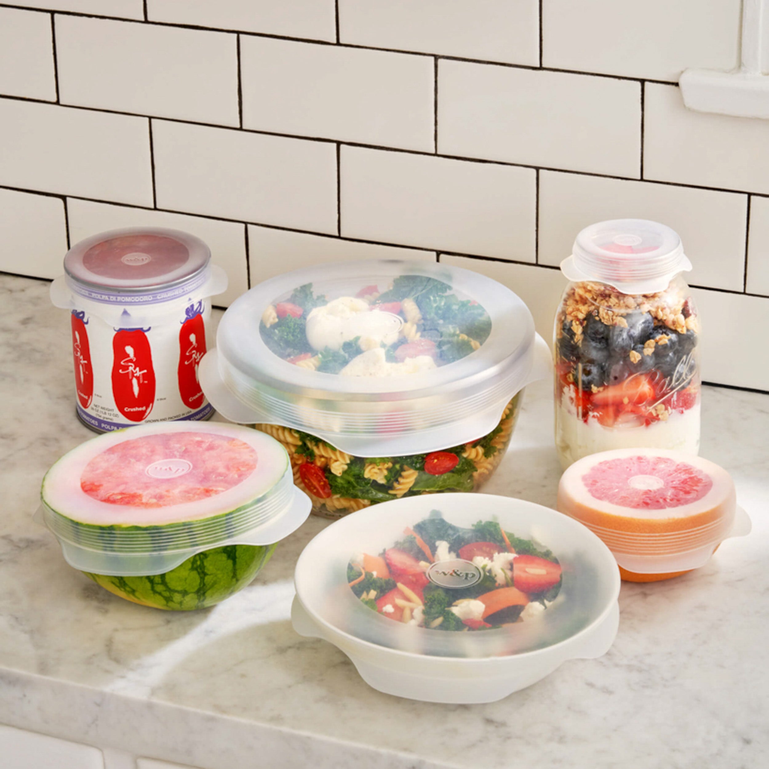A set of 6 Reusable Stretch Lids to help eliminate food waste by saving and storing leftovers, without the single-use plastic. Multiple lid sizes stretch to fit a variety of shapes from small tuna cans to large serving bowls and everything in between and feature textured interior grips that offer a super tight cling on slippery glass and ceramic. Lid sizes: 2.5", 3.8", 4.5", 5.7", 6.5" and 8.0".