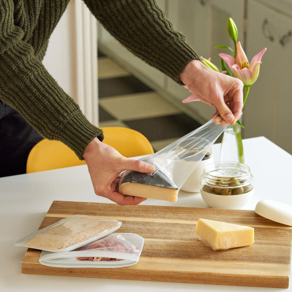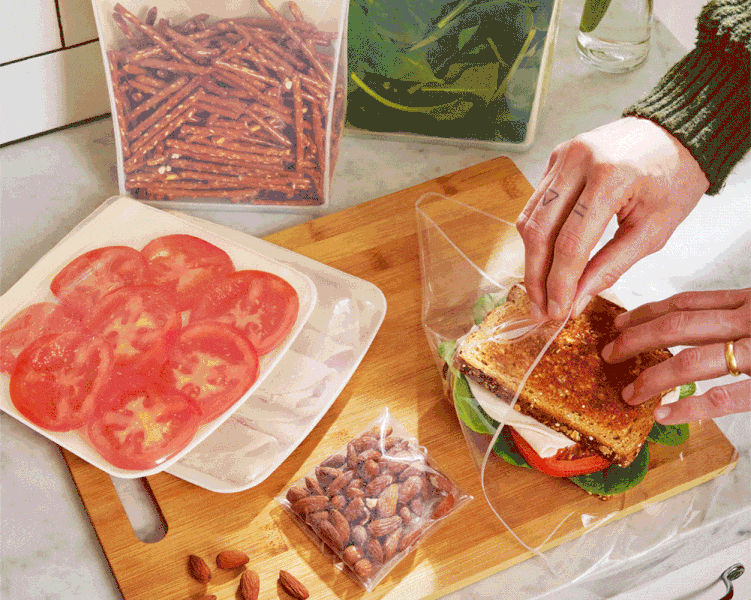 A perfectly plastic-free sandwich bag crafted from 100% food-grade silicone with no chemicals, glues, or adhesives. This 34 oz bag is perfect for taking sandwiches to go or for keeping cheeses, lunch meats, and more fresh in the fridge. All of our bags are made from a single piece of silicone with curved edges so you don’t get any moldy buildup.